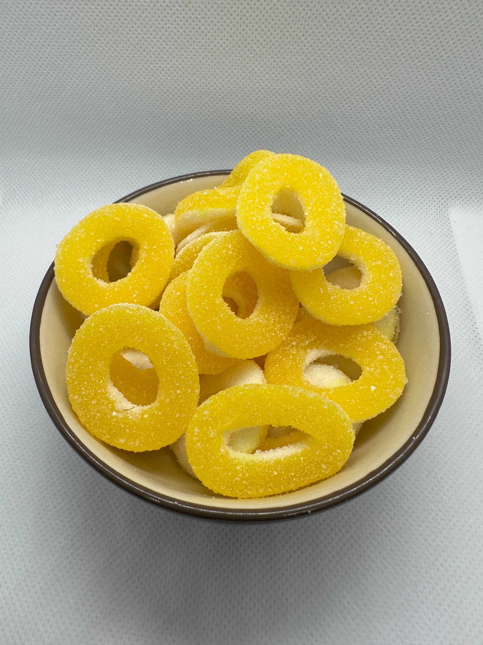 Sirop de glucose, sucre, eau, gélatine bovine halal, amidon modifié de pomme de terre, acidifiants : E296, E330, E270, arômes, colorant E100.