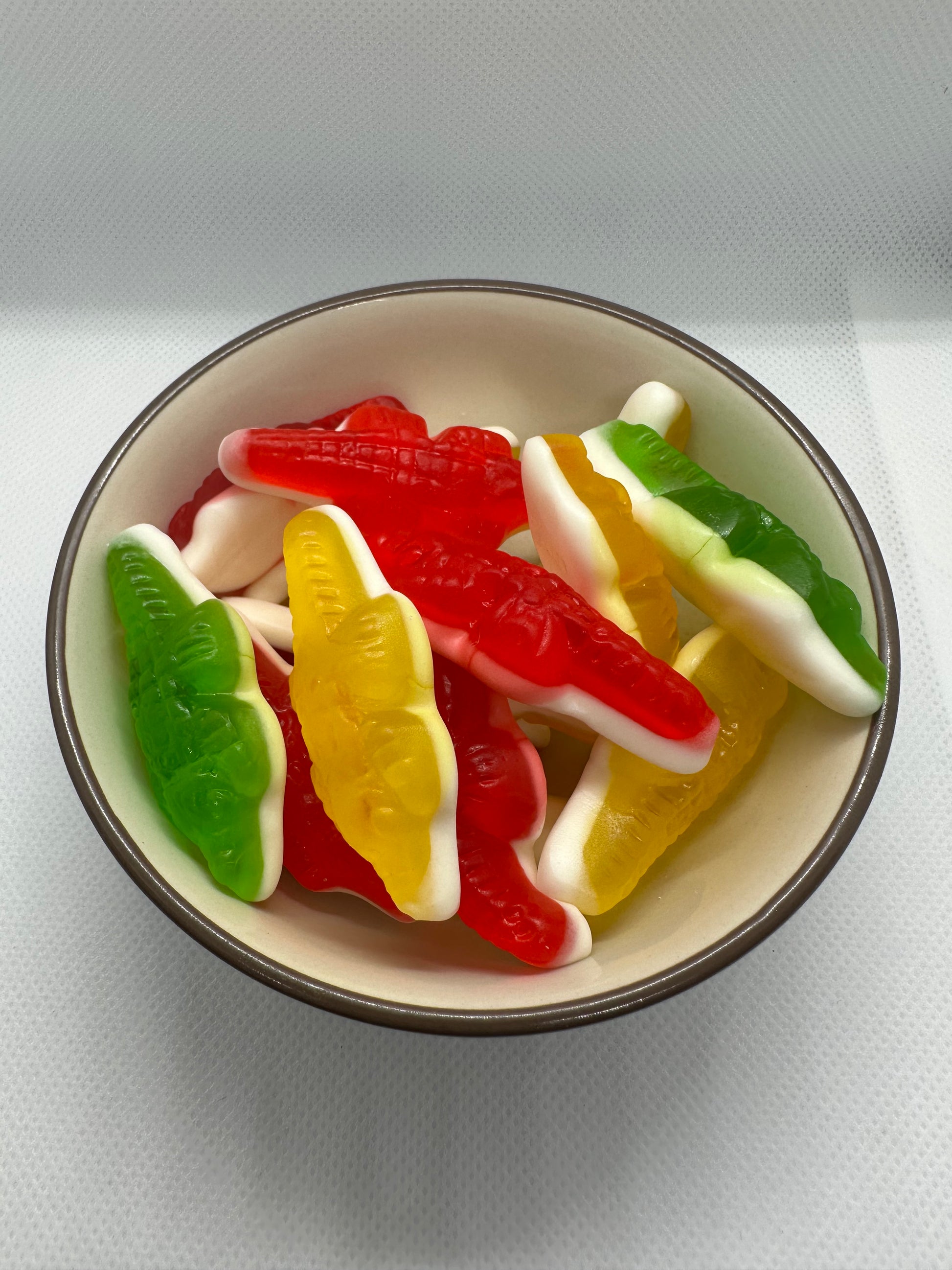 Sucre, sirop de glucose, gélatine halal, acidifiants : E270, E330, E296, arômes, agents d’enrobage (huile de coco, colza), cire de carnauba, colorants : E102, E129, E133, E150d, E516.