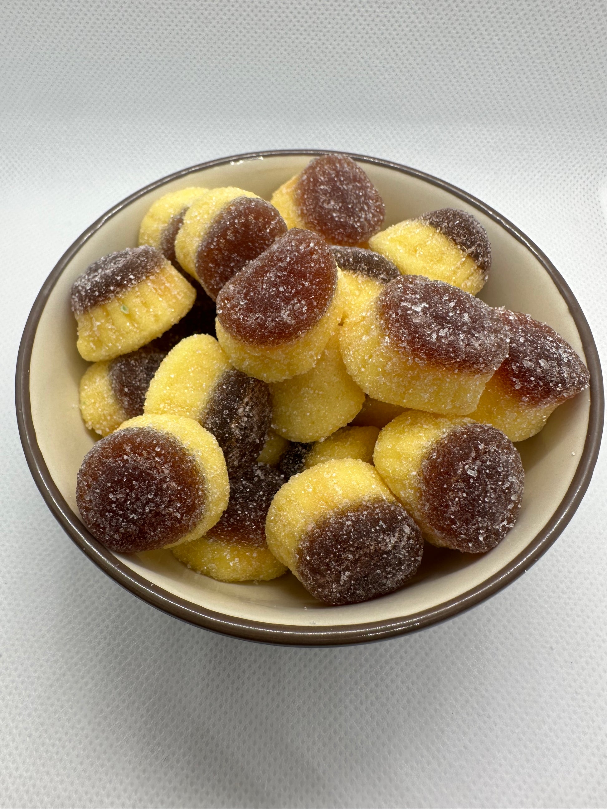 Sirop de glucose, sucre, eau, gélatine bovine halal, amidon modifié de pomme de terre, acidifiants : E330, E296, arômes, agent d'enrobage : cire de carnauba, colorants : E150c, E100.