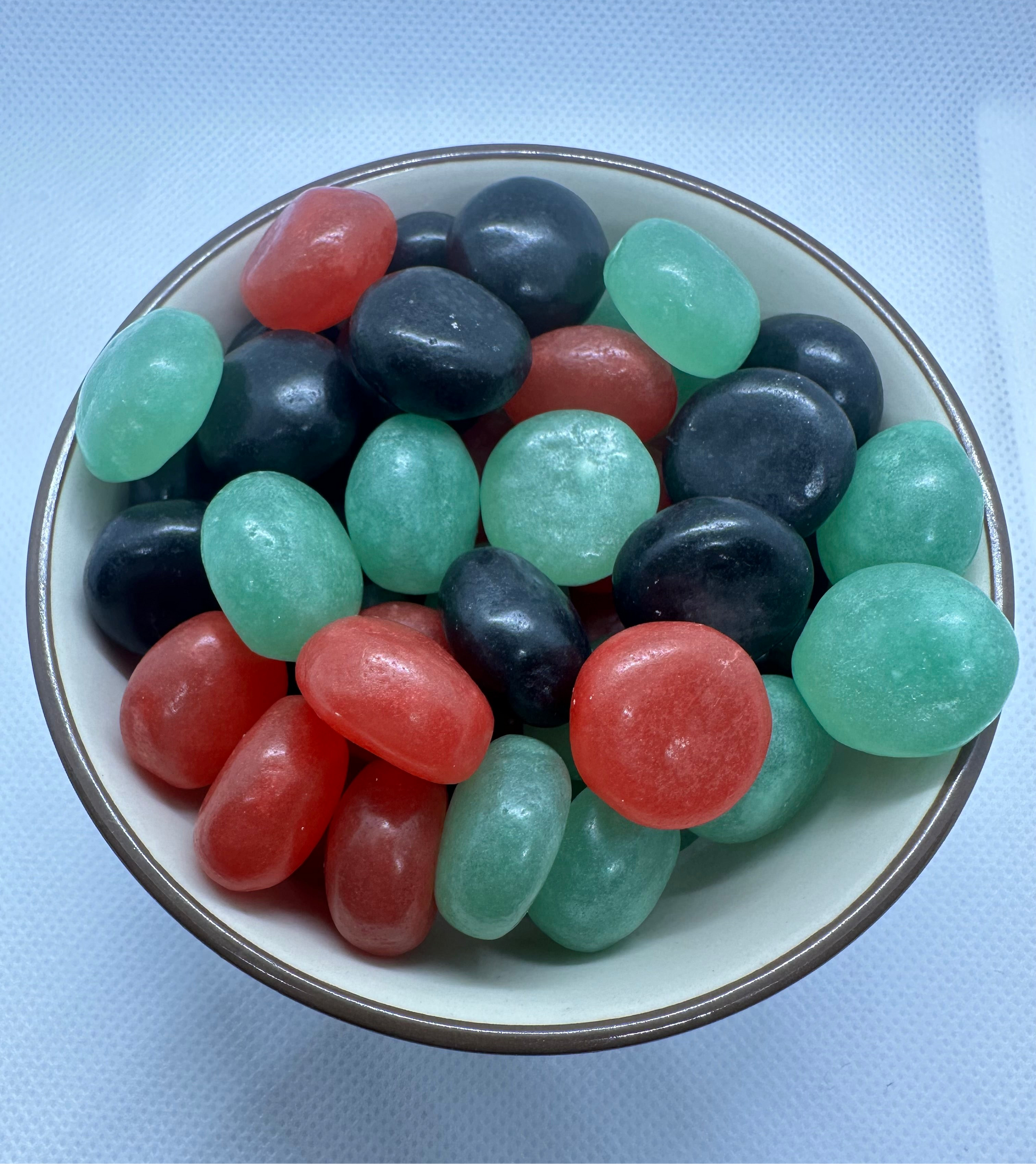 Sucre, sirop de glucose, amidon, acidifiant : acide citrique, acide malique, correcteurs d'acidité : citrate monosodique, citrates de calcium, malates de sodium, arômes, colorants : curcumine, bleu patenté V, charbons végétal, carotènes mélangés, anthocyanes, agents d'enrobage : cire de carnauba.