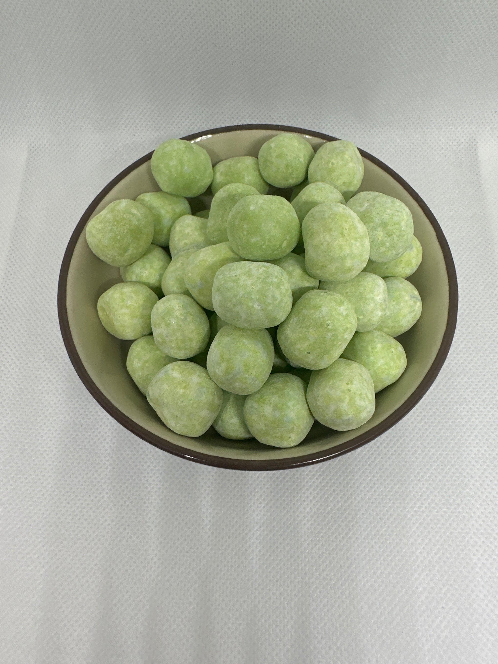 Sucre, sirop de glucose, graisse végétale totalement hydrogénée de coprah, dextrose, humectant : sorbitols, stabilisant : gomme arabique, maltodextrine, acidifiants : acide citrique - acide malique, amidon, jus concentré de pomme, arôme naturel, correcteur d'acidité : malates de sodium, émulsifiant : mono- et diglycérides d'acides gras, concentrés de spiruline et carthame.