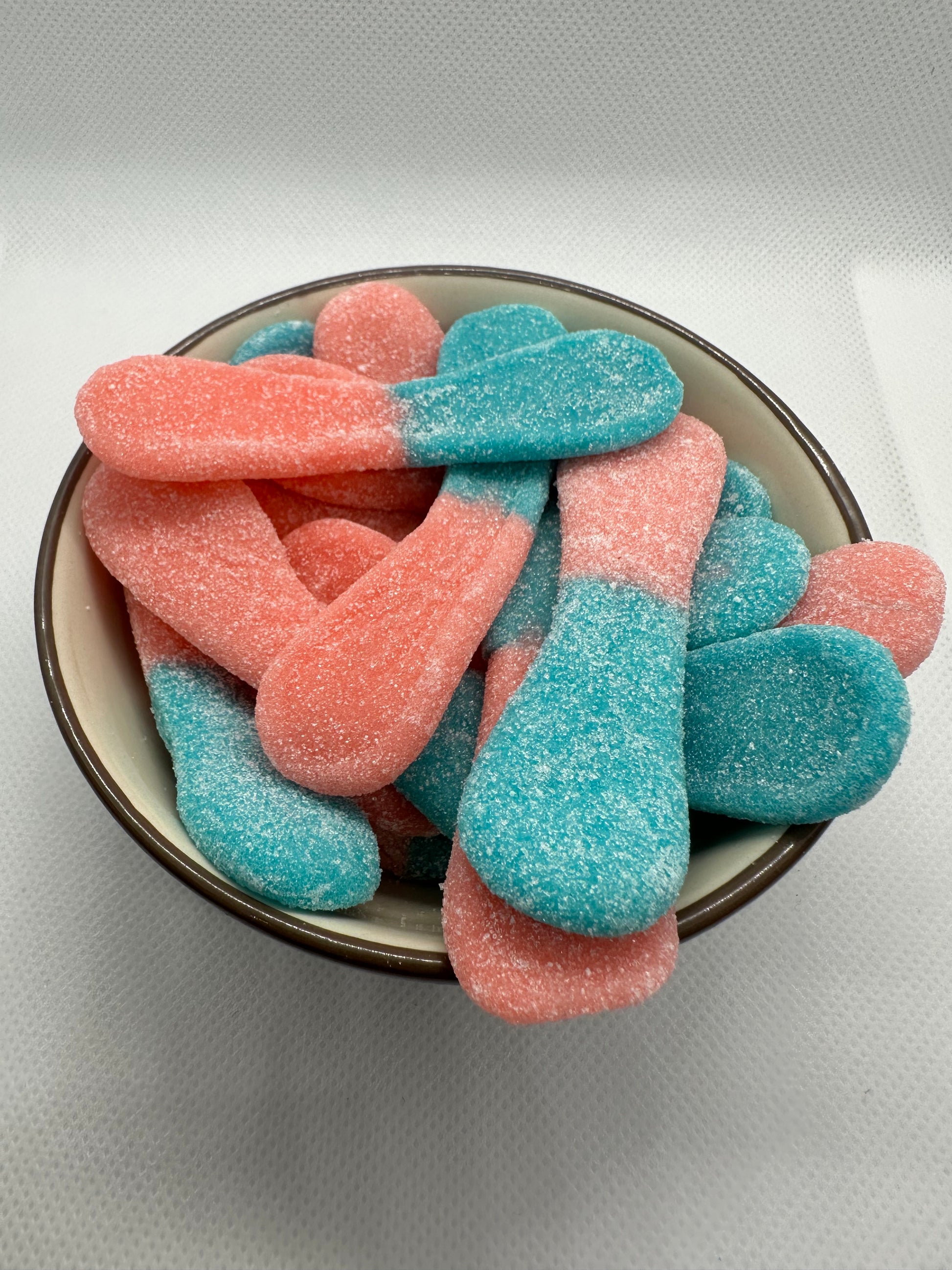 Sirop de glucose, sucre, eau, gélatine bovine halal, amidon, acidifiants : E296, E330, E270, arôme, agents d'enrobage : monostéarate de glycérol, (tournesol E471), huile végétale (coco, karité), colorants : E133, E129.