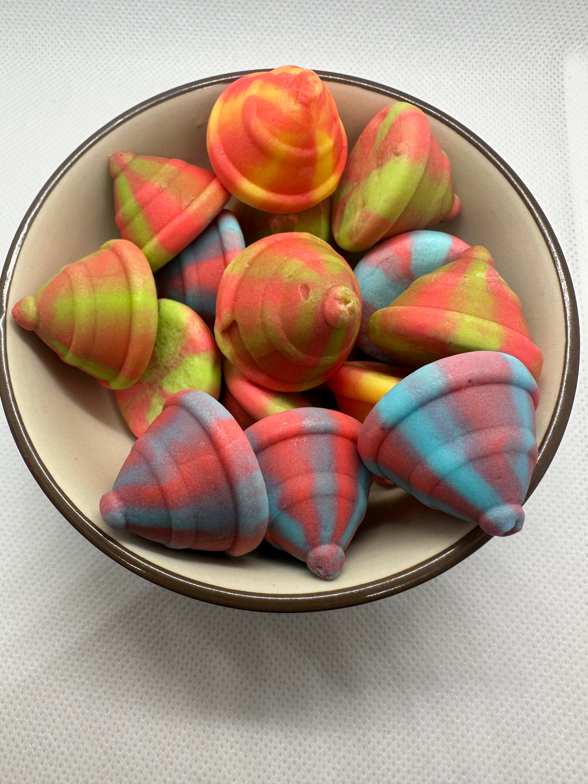 Ingrédients: sucre, sirop de glucose, eau, gélatine halal, acidifiants E330, E296,E270, arômes, colorants() huile végétale (palme) agent d'enrobage cire de carnauba