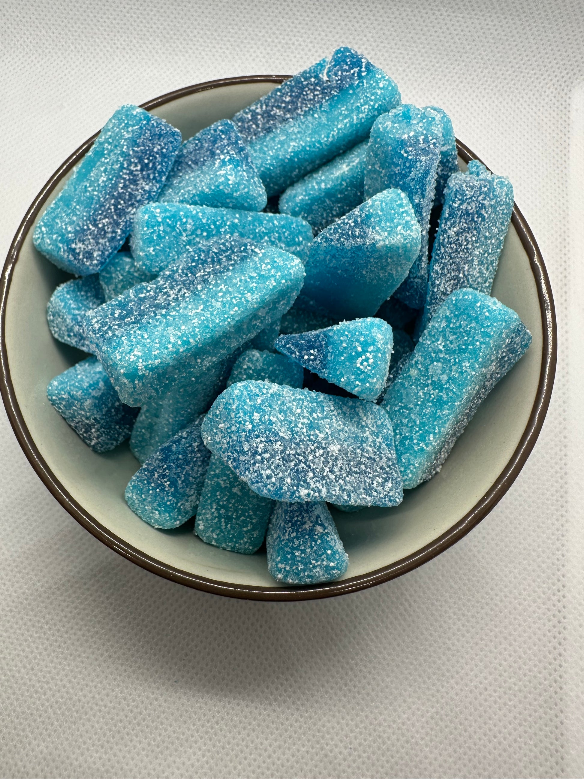 Sucre, sirop de glucose, gélatine halal, acidifiants : E330, E270, E296, arômes, agents d’enrobage (huile végétale de coco, colza), cire de carnauba.