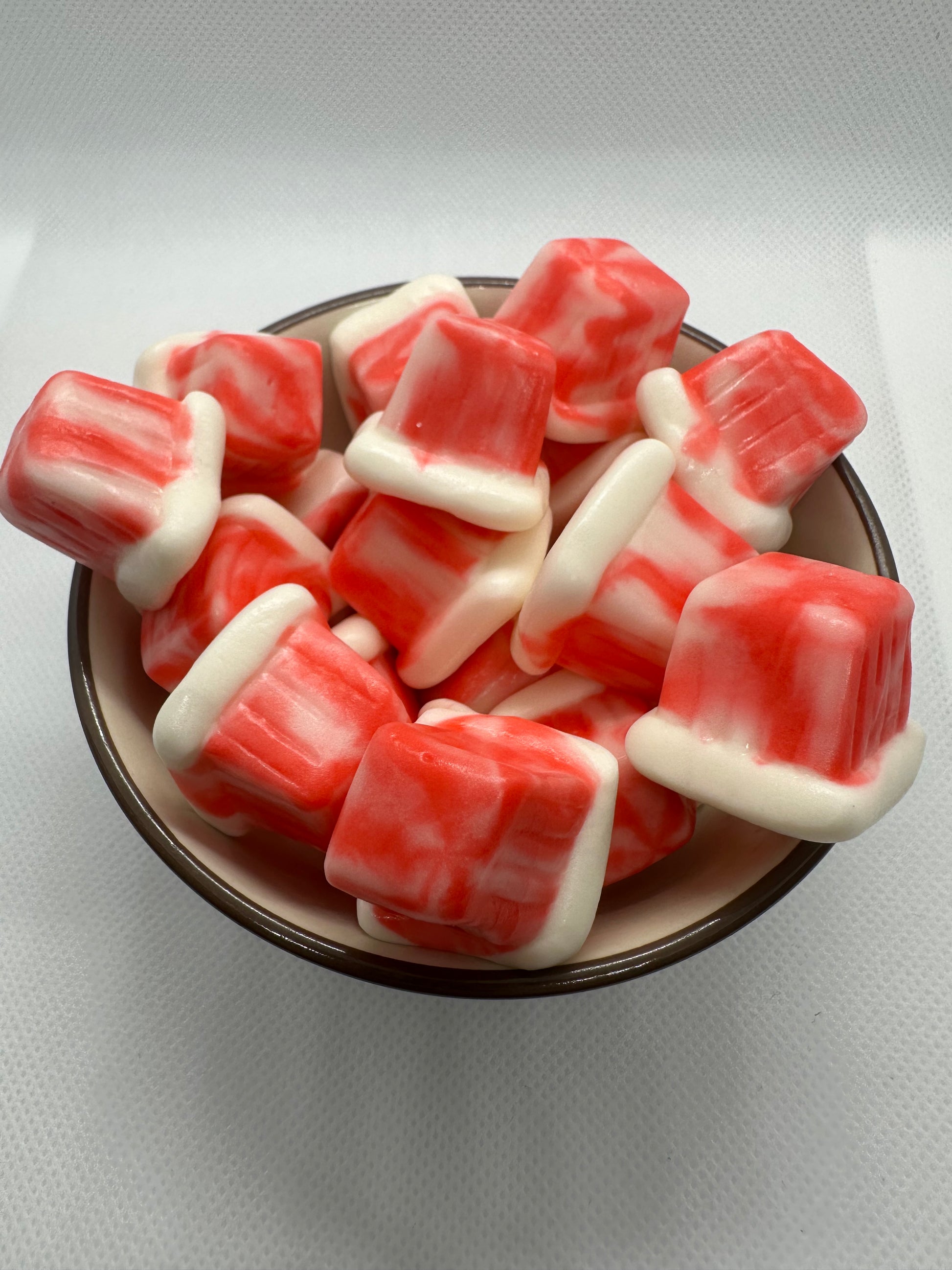Sucre, sirop de glucose, eau, gélatine halal, acidifiants : acide citrique (E330), acide lactique (E270), acide malique (E296), arômes, colorants : E129, E160a, huile végétale (noix de coco), agent de démoulage : cire de carnauba (E903), correcteur d’acidité : citrate de sodium (E331).